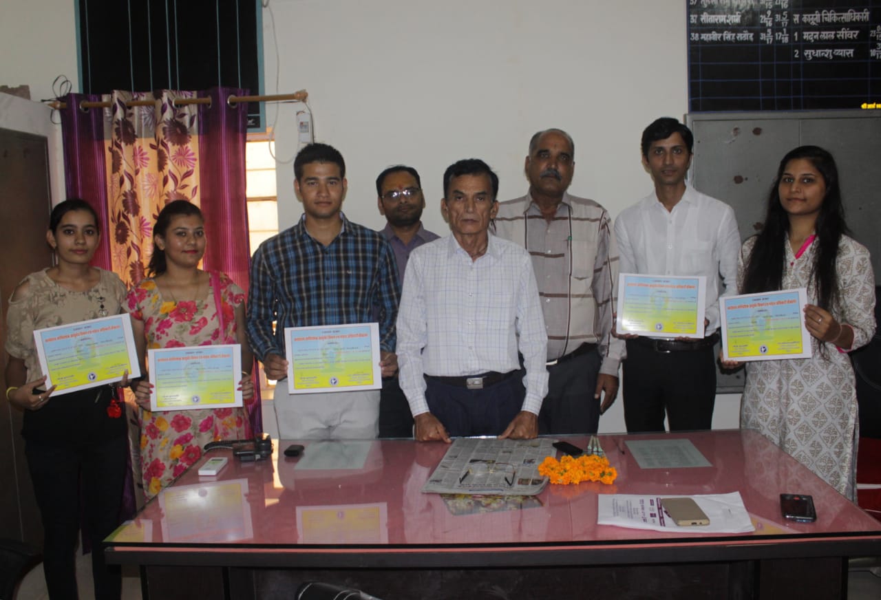 बीकानेर। अंतरराष्ट्रीय योग दिवस के जिला स्तरीय मुख्य समारोह को सफल बनाने में योगदान देने वाले योग शिक्षकों का मंगलवार को पॉलिटेक्निक कॉलेज रोड स्थित अतिरिक्त निदेशक आयुर्वेद विभाग के संभाग कार्यालय में योग शिक्षकों के सम्मान के लिए समारोह आयोजित किया गया। जिसमें आयुर्वेद विभाग के अतिरिक्त निदेशक डॉ. महावीरसिंह राठौड़ एवं जिला आयुर्वेद अधिकारी डॉ. राधेश्याम इंदौरिया ने योग दिवस पर महत्वपूर्ण भूमिका निभाने वाले मुख्य योग प्रशिक्षक दीपक शर्मा और उनके सहयोगी योग शिक्षक अमित पुरोहित, ऋषिका व्यास, श्वेता व्यास, मानसी पुरोहित को सम्मानित किया गया।