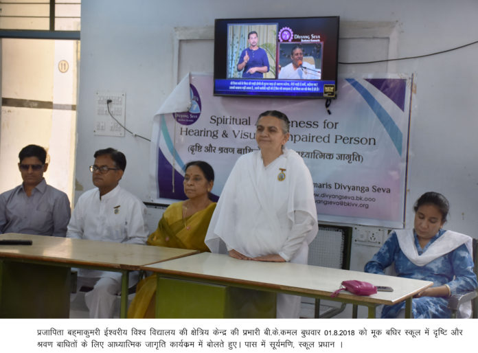 बीकानेर। प्रजापिता ब्रह्माकुमारी ईश्वरीय विश्वविद्यालय के दिव्यांग सेवा प्रभाग की ओर से विकलांगों में आध्यात्मिक, नैतिक व मानवीय मूल्यों के विकास के लिए निर्मित 3डी ऑडियो, वीडियों चित्र प्रदर्शनी का दो दिवसीय आयोजन मंगलवार व बुधवार को राजकीय उच्च माध्यमिक नेत्रहीन विद्यालय व राजकीय मूक बधिर विद्यालय में किया गया।