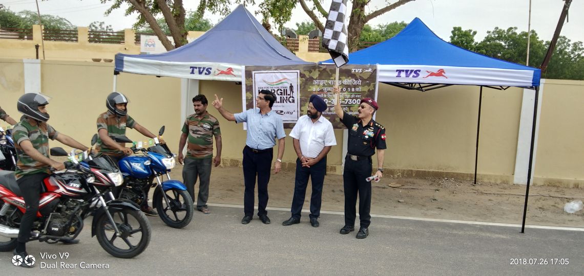 बीकानेर। कारगिल विजय दिवस 26 जुलाई के उपलक्ष्य में दुपहिया वाहन कंपनी टीवीएस की ओर से स्थानीय मुख्य अधिकृत डीलर शान्ति मोटर्स द्वारा कारगिल कॉलिंग रैली आयोजित की गई। रैैैली का नेेतृत्व भुुुवन पणिया और गौरव जाजड़ा ने किया।